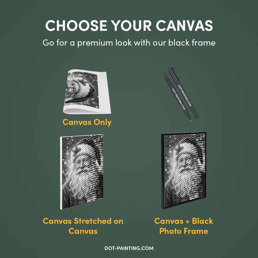 • 1x Premium lærred (rullet): Lærred i høj kvalitet med dit valgte design. Vi sender det rullet i et hårdt rør, aldrig foldet, så du starter med en glat, krølfri overflade.