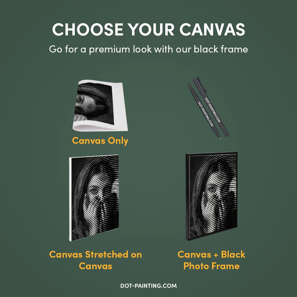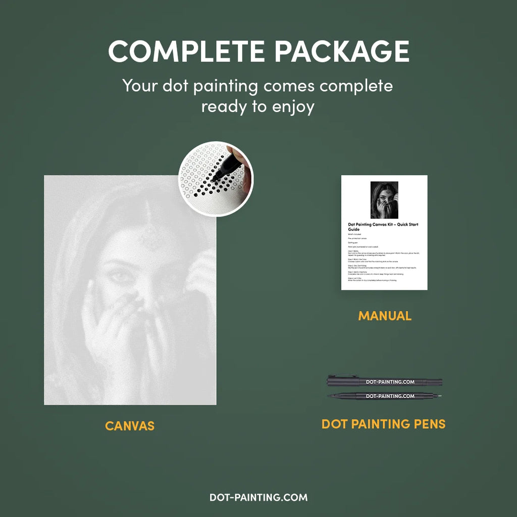 • 1x Premium lærred (rullet): Lærred i høj kvalitet med dit valgte design. Vi sender det rullet i et hårdt rør, aldrig foldet, så du starter med en glat, krølfri overflade.